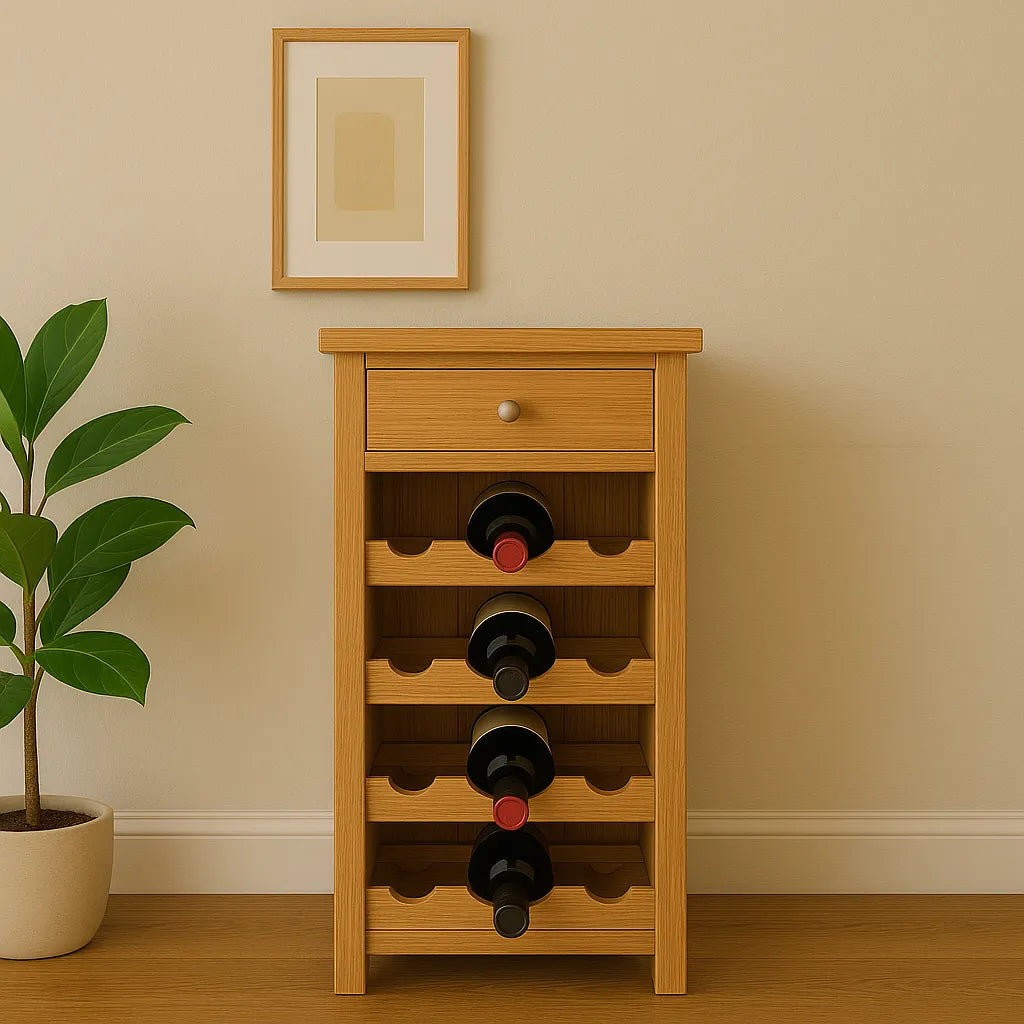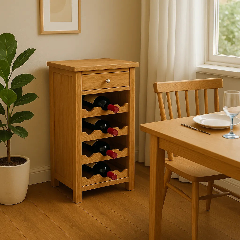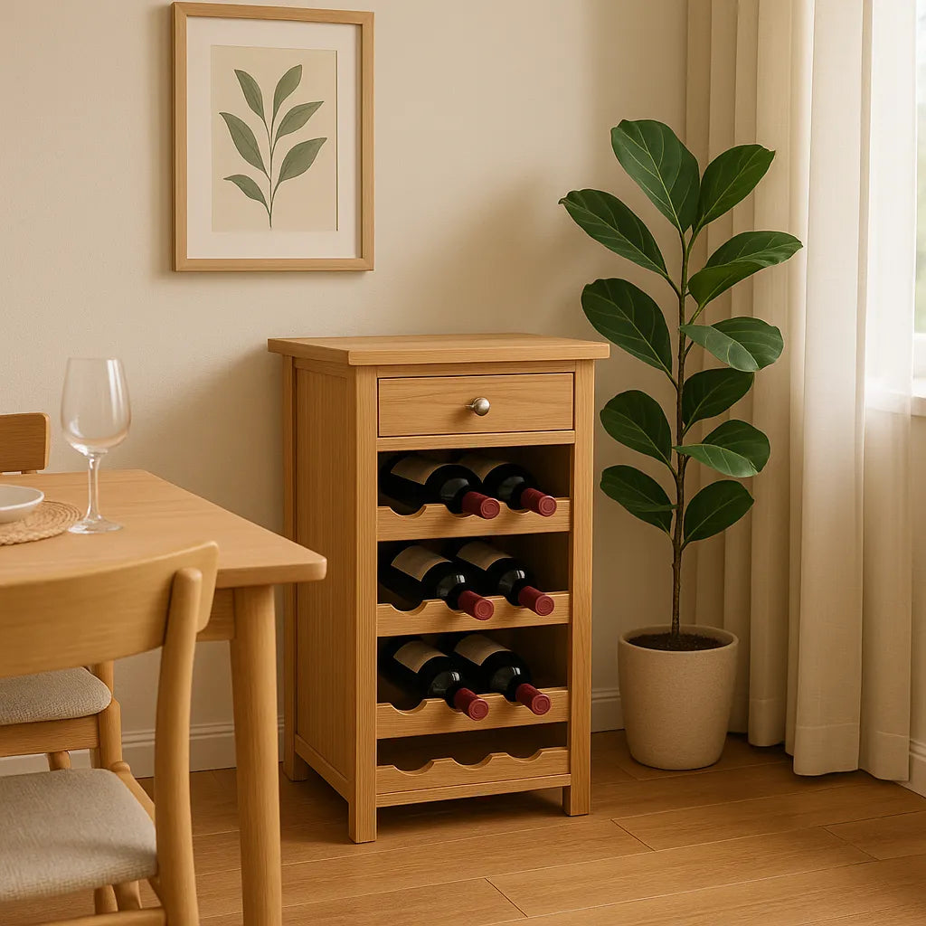 Enhance a small dining area with the compact wine cabinet designed to save space. This unit holds up to twelve bottles in four open racks, offering easy access and neat display. A top drawer provides a place for tool or napkin. With a slim profile, the cabinet fits into a corner or a narrow gap. The light finish and rounded edges create a gentle presence, blending into dining or kitchen setting. Suitable for a modern setup where storage meet clean design.