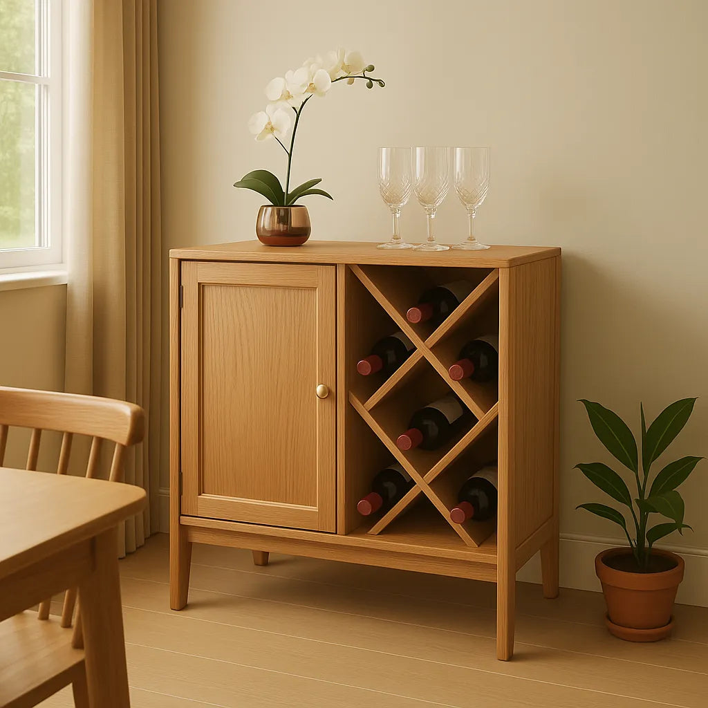 Diamond wine cabinet brings a structured look to bottle storage with its distinct X shaped shelf design. Created for those who value symmetry and visual order, the open cubby holds each bottle in a diamond layout. A side compartment with a hinged door offers enclosed space for a glass or wine accessory. With a natural finish and well-balanced shape, the cabinet fits into a classic or minimalist setting. Whether placed for daily use or quiet enjoyment, this piece helps keep a wine collection arranged with care.