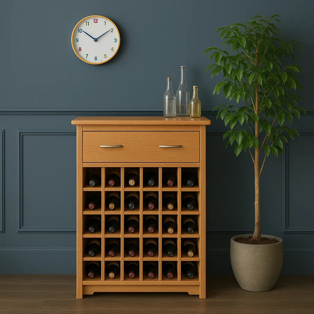 Keep a bottle organized with the Grid Wine Cabinet that stores a collection neatly. This space efficient unit features a structured layout of twenty five open slot, giving each bottle a secure place. A full width drawer above offers room for a tool, coaster, or linen, keeping an essential within easy reach. Its sturdy form, soft finish, and timeless shape make it a natural fit in a dining room, kitchen, or casual bar. The grid wine cabinet is perfect for a collector who values clean display and everyday functionality. Whether hosting a friend or storing a curated selection, this piece delivers simplicity, order, and quiet charm.