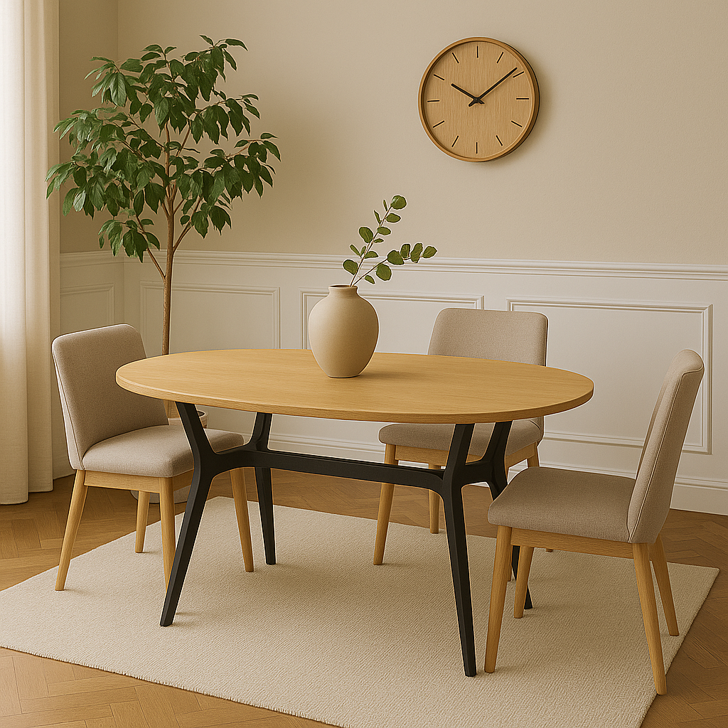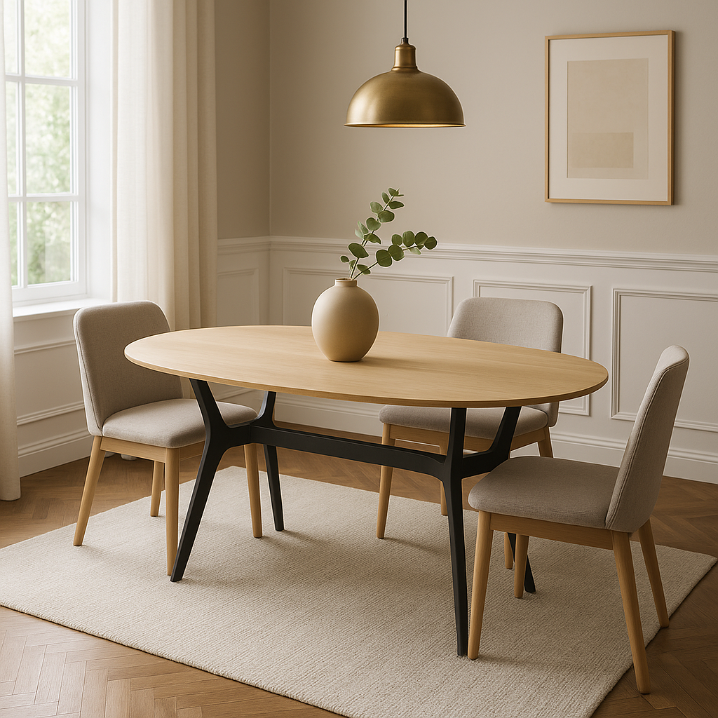 Create a striking focal point in the dining area with this oval modern table featuring a curved top and dark leg for strong visual contrast. The soft shape supports natural movement and relaxed gathering, whether during a quiet breakfast or evening meal. A metal base adds structure with a sculptural form that complements a clean design. Suitable for an open plan layout or a room with gentle lines, this table brings balance and presence without excess. Paired with a simple seat or cushioned chair, it sets the tone for a warm and modern dining experience. Designed to seat four to six guest in comfort.