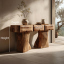 The console table embraces natural imperfections, raw edges, and irregular forms, reflecting the earthy beauty of solid wood. Its sculptural pedestal bases give the piece a bold and artistic silhouette, making it a standout focal point in any setting.