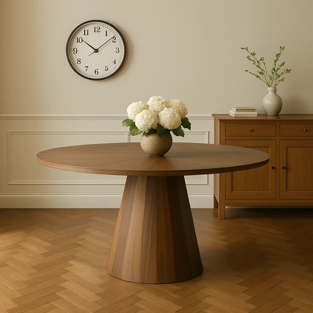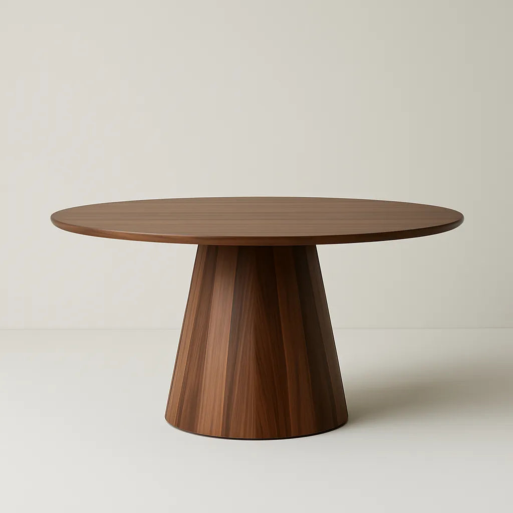 Dramatic elegance defines the space with the sculptural round dining table that commands attention. This table features a bold cone-shaped pedestal base and a smooth circular top, offering a blend of form and function. A deep tone and architectural shape create a strong visual point in modern or transitional interior. The round surface encourages easy conversation and gentle flow, fitting for an intimate meal or daily use. A tapered base supports the structure while adding a gallery-like presence. Suitable for a refined dining room or design-focused apartment, this sculptural round dining table turns the everyday setting into something distinct. A statement for those who lean toward timeless shape with a contemporary note.