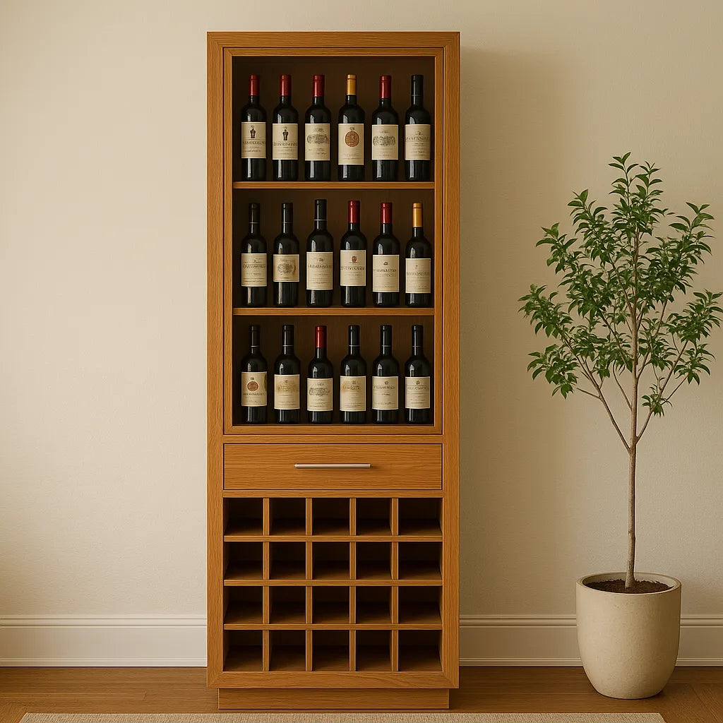 Tall wine cabinet with open cubby, adjustable shelf, and central drawer offers vertical arrangement for bottle and item. The slim frame fits into a kitchen corner, lounge area, or dining room without taking up much floor space. A neutral tone and clean outline allow the cabinet to blend into various interior settings. The open cubby supports visible storage, while the enclosed drawer provides a place for a cork or tool. With a balanced layout, this cabinet brings quiet structure to a compact area.