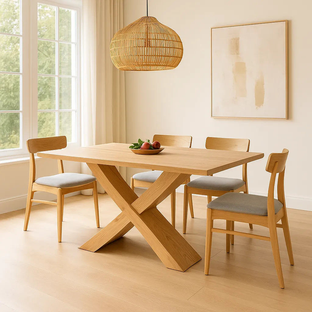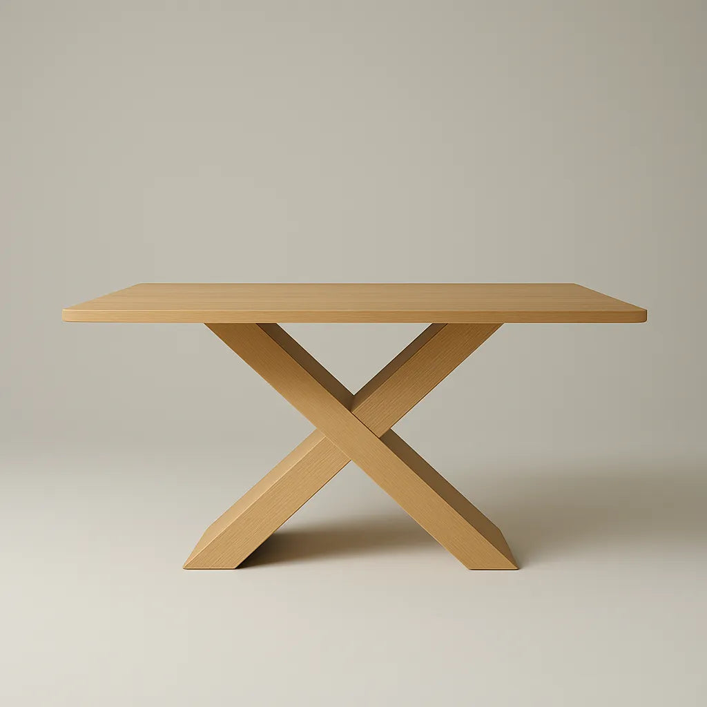 A modern dining space takes form with the X base dining table, defined by a rectangular top and sculpted base crossing at center. The intersecting leg design adds visual rhythm while supporting the overall structure. A smooth surface offers room for daily meals, light work or quiet conversation. The clean outline and natural tone help the table fit into a calm interior setting. Positioned in an open layout or quiet corner, this table supports a balanced flow between function and simplicity.